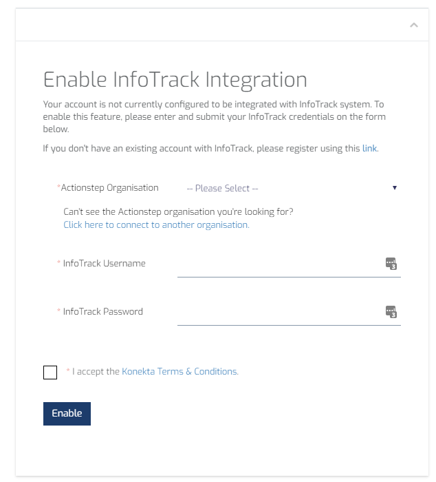 - Select your Actionstep organisation and then enter your valid InfoTrack credentials. Click on Enable.