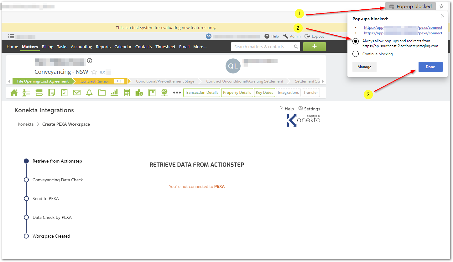 When you are shown the following error: "You're not connected to PEXA" and no sign-in popup window appears, check the following: