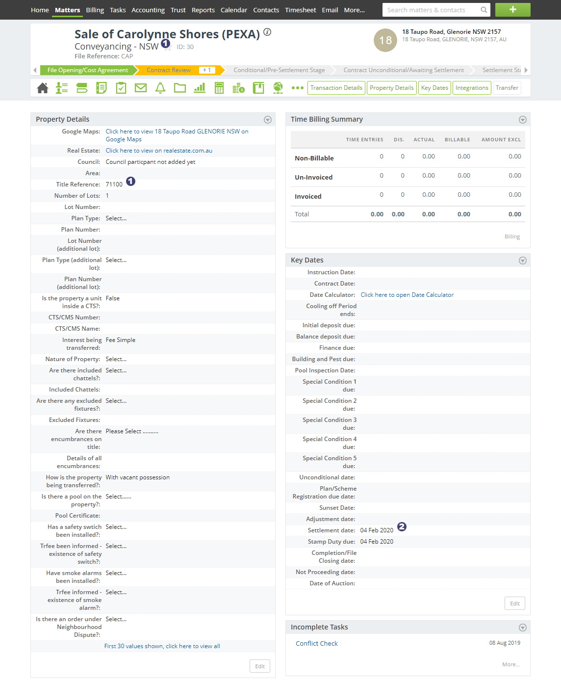 | 1 | Matter Type Title Reference | Property Address | Conveyancing - NSW, 71100 -> NSW, 71100 |