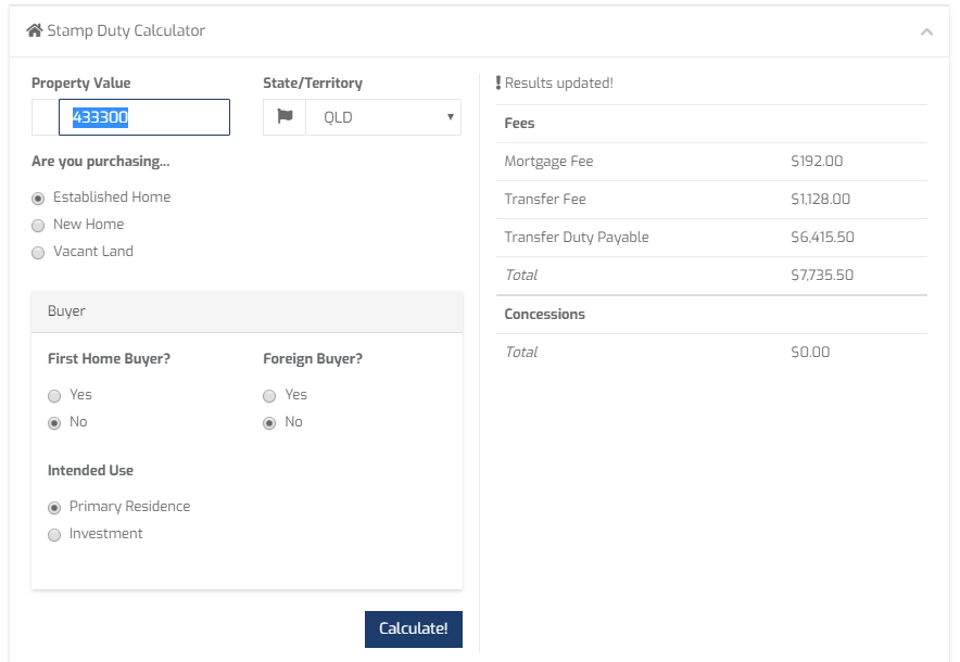 The Konekta plugin includes a Stamp Duty Calculator for Queensland which produces the amounts required for stamping. *** NOTE these figures are not pre-polulated back within the matter, you will need to manually record them. The calculator is purely for your assistance.