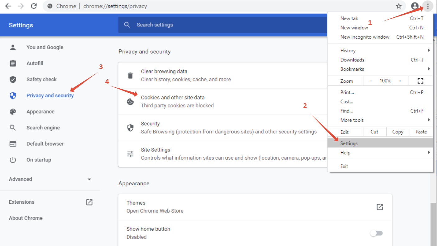 In Chrome, navigate to Settings > Privacy and security > Cookies and other site data: