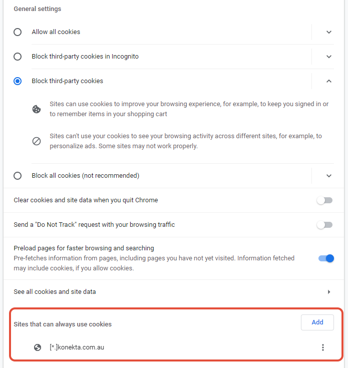 Scroll to the bottom of the page and add [*.]konekta.com.au to the list of Sites that can always use cookies